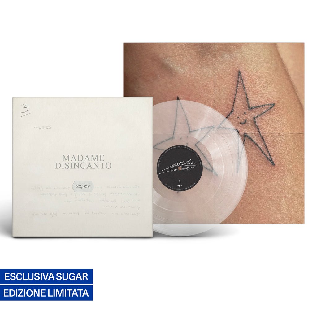 “Disincanto” è il nuovo e terzo album di Madame, in uscita il 17 aprile 2026 per Sugar Music e acquistabile in vinile con poster e CD. Questa edizione in vinile trasparente autografato con poster e cover alternativa è disponibile in esclusiva su shop.sugarmusic.com.